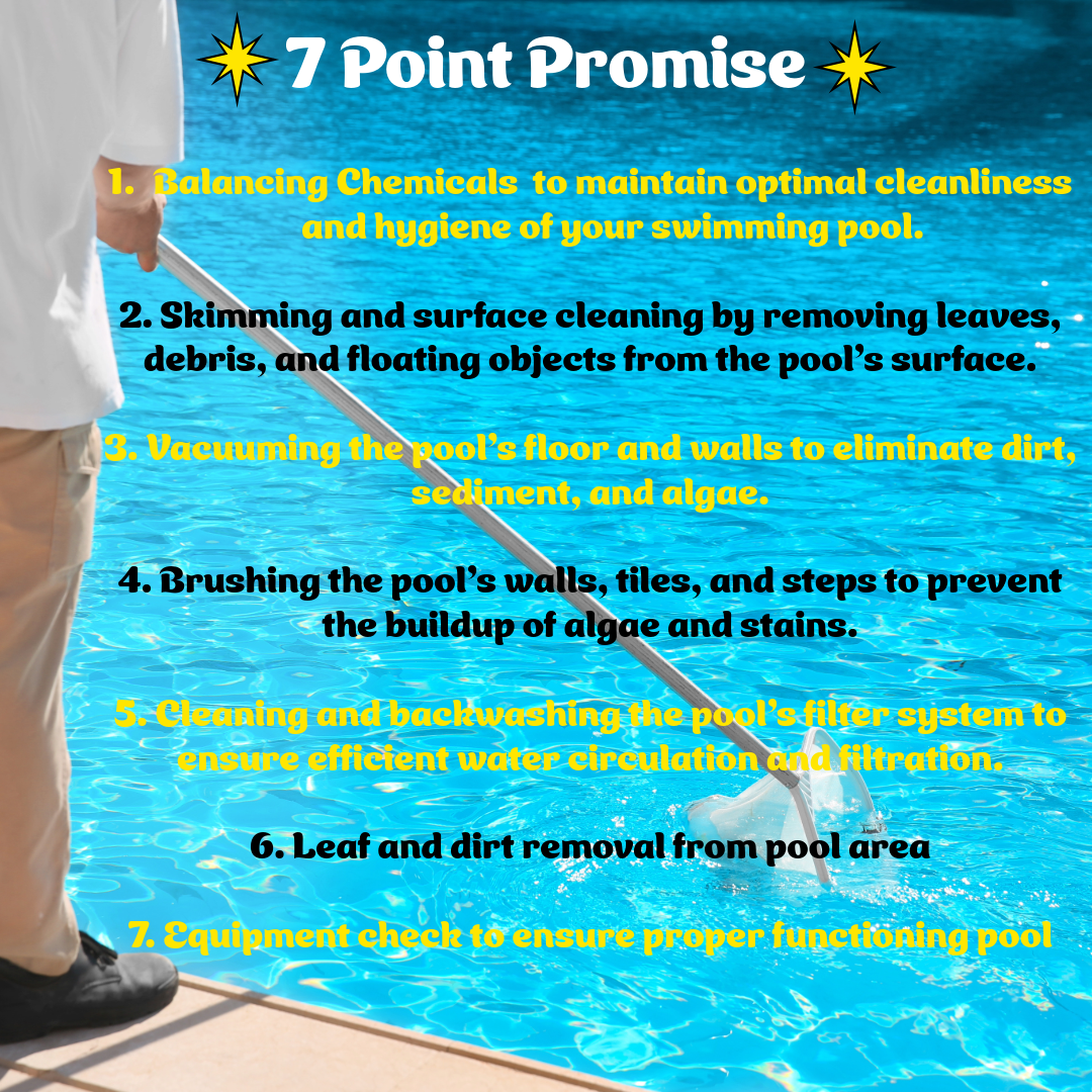 Skimming and surface cleaning by removing leaves, debris, and floating objects from the pool’s surface.